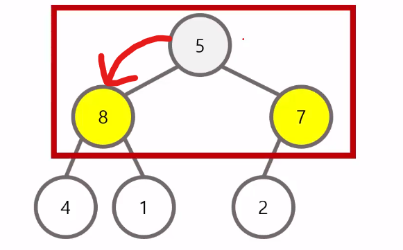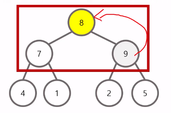 삭제 이후에는 리프 노드까지 내려가면서 최대 힙을 구성한다.(하양식)